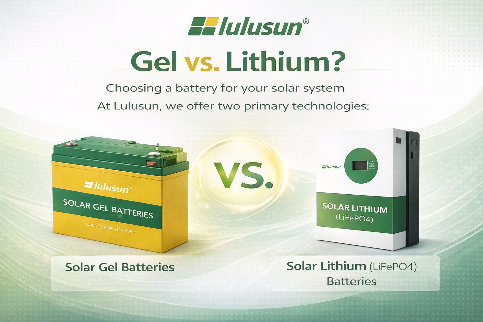 Choosing a battery for your solar system is like picking the heart for your home's energy. At Lulusun, we offer two primary technologies: Solar Gel Batteries and Solar Lithium (LiFePO4) Batteries.